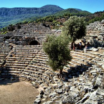 Kaunos ist eine archäologische Stätte in Dalyan mit Überresten eines Hafens, von Tempeln, Badeanlagen, einem Theater mit Platz für 5000 Zuschauer und in Stein gemeißelten Gräbern entlang des Dalyan-Flusses. Die Ruinen erstrecken sich über mehrere Bereiche des antiken Ortes, die durch Wege miteinander verbunden sind.