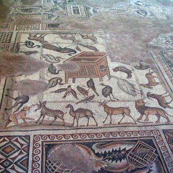 Die zentrale Mosaikkomposition zeigt eine detaillierte Darstellung der Arche Noah mit 23 Vögeln und verschiedenen Wild- und Haustieren.