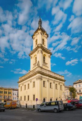 Das Gebäude vereint architektonische Elemente polnischer und ukrainischer Traditionen mit Skulpturen von Johann Georg Pinsel an den Außenwänden.