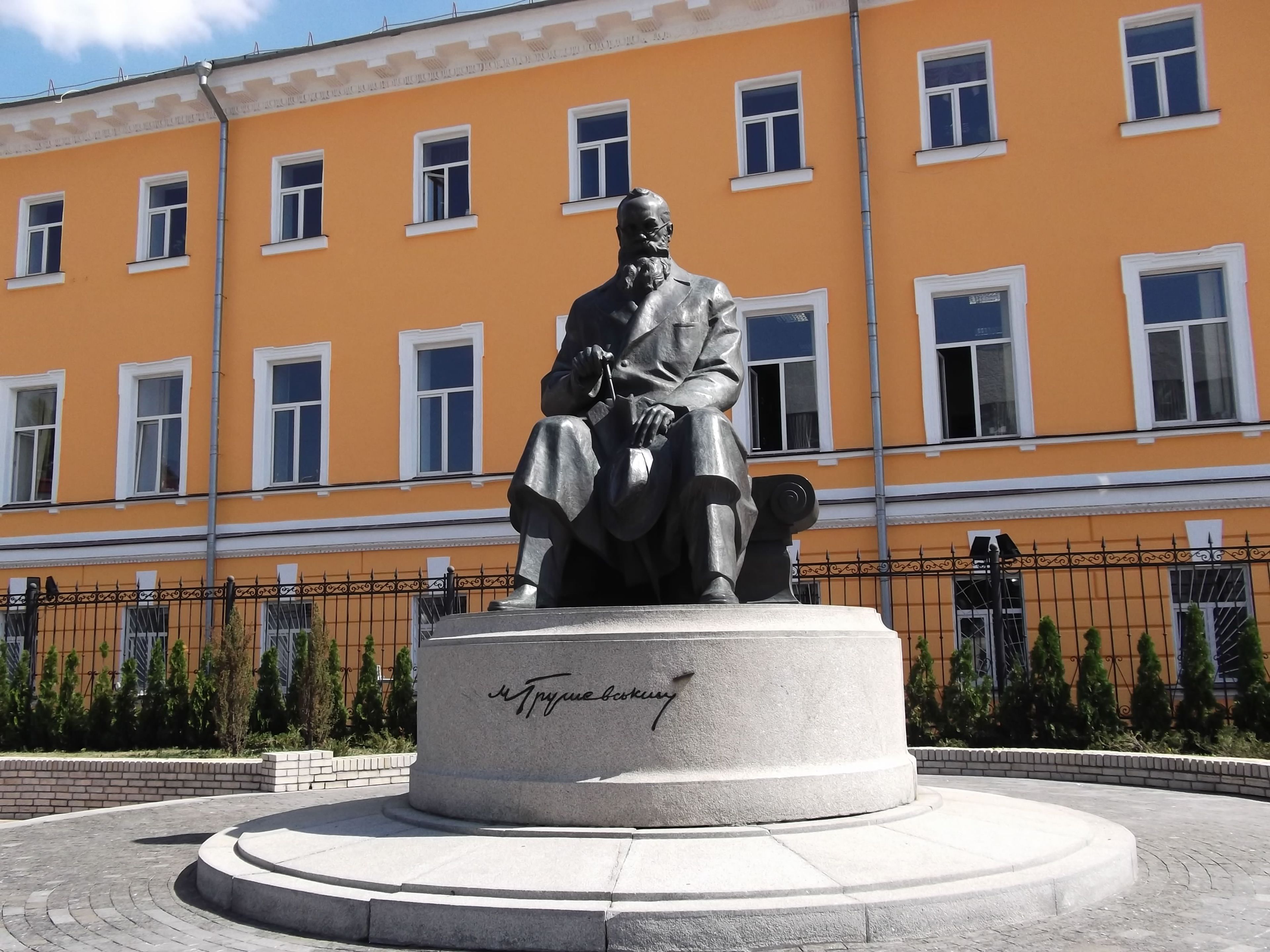 Die Statue würdigt Hrushevskyis Forschung und die Veröffentlichung der zehnbändigen Geschichte der Ukraine-Rus Serie.