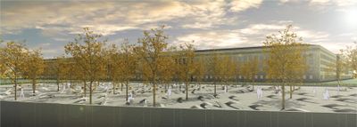 Das Denkmal zeigt 184 beleuchtete Bänke auf zwei Hektar Landschaftsgarten mit fließendem Wasser und Ahornbäumen im gesamten Bereich.