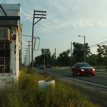 Das Gemeindezentrum mit seinem roten Backsteingebäude steht noch aufrecht, während drum herum die Häuser verschwinden. Die wenigen Wohnwagen und improvisierten Unterkünfte am Stadtrand zeigen, dass einzelne Menschen den Ort nie ganz aufgegeben haben.