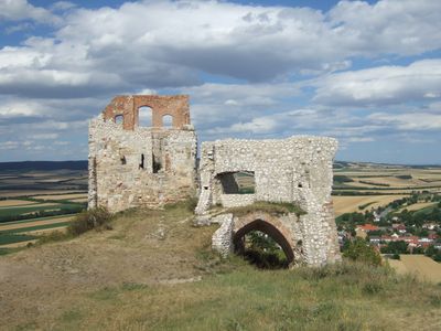 Burgruine Staatz ist eine mittelalterliche Burgruine, die auf einer über 100 Meter hohen Kalksteinklippe thront und ein markantes Profil gegen die Ebene der Region Laa bildet. Die Überreste zeigen Toranlage, Teile der Haupthalle und Fenster aus der Romanik.