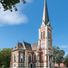 Die Kirche zeigt neugotische Architektur mit Spitzbögen, aufwendigen Steinmetzarbeiten und einem hohen Turm, der über die Stadtparklandschaft ragt.