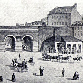 Der Rote Turm war ein Ziegelbau mit spitzem Dach und vier Ecktürmchen, der die historische Stadtmauer markierte.