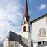 Das Kirchengebäude zeigt die typische alpine Bauweise mit weißen Wänden und einem hohen Glockenturm mit grüner Turmspitze.