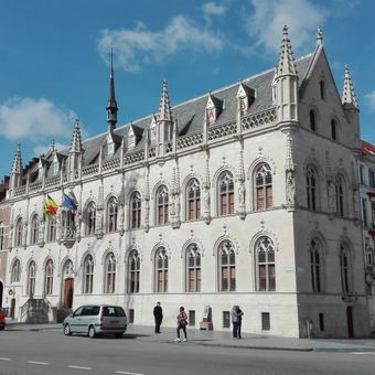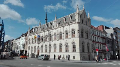 Das Rathaus zeigt gotische und Renaissance-Architekturelemente mit einer Fassade, die Statuen der Grafen von Flandern und neun Dachgauben aufweist.
