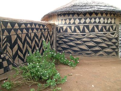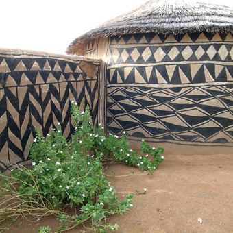 Die Frauen der Gemeinschaft pflegen die Tradition, die Gebäude mit geometrischen Mustern unter Verwendung natürlicher roter, weißer und schwarzer Pigmente zu verzieren.