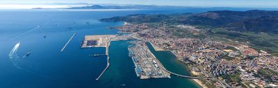 Der Hafen von Algeciras wickelt bedeutenden Containerverkehr ab und betreibt regelmäßige Fährverbindungen nach Nordafrika als zentraler Verkehrsknotenpunkt.