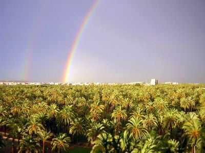 Der Palmeral erstreckt sich über 144 Hektar mit über 200.000 Dattelpalmen, die durch ein Netz von Bewässerungskanälen in geometrischen Mustern angeordnet sind.