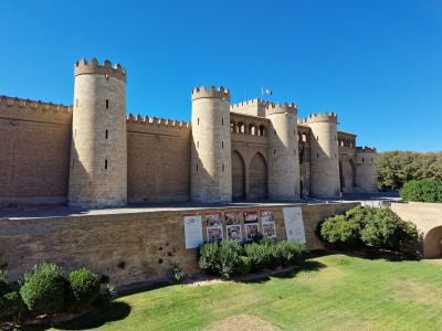 Aljafería ist eine befestigte Palastanlage in Saragossa, Spanien, die Elemente maurischer, gotischer und Renaissance-Baukunst in sich vereint. Dicke Verteidigungsmauern mit halbrunden Türmen umgeben mehrere Innenhöfe, Säle und Kapellen, die über die Jahrhunderte hinweg erweitert wurden.