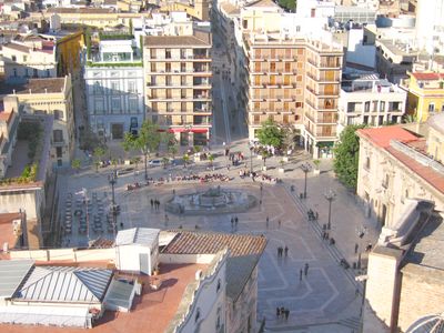 Plaça de la Mare de Déu, Hauptplatz in La Seu, Valencia, Spanien.