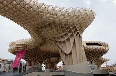 MetropolParasolbildeteinevergitterteÜberdachungausHellemHolz,diesichüberdengrößtenTeilderPlazadelaEncarnaciónerstreckt.DieSäulenundRippenverlaufenschrägnachobenzueinerausgefranstWellenforminetwaSechsundzwanzigMeterHöhe.
