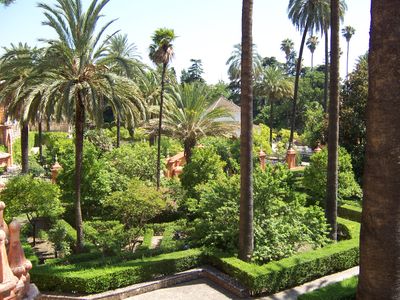 Der Garten des Königlichen Alcázars ist eine große Gartenanlage in Sevilla, die maurische und europäische Stilelemente kombiniert. Das Areal enthält Wasserbecken, künstliche Kanäle, Brunnen und regelmäßig angeordnete Blumenbeete, die in einem symmetrischen Muster angeordnet sind.