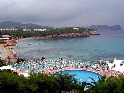 Cala Nova erstreckt sich 400 Meter entlang der Ostküste von Ibiza, mit sanften Hängen aus goldenem Sand, die auf das Mittelmeer treffen.