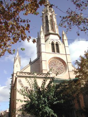 Die Santa-Eulàlia-Kirche zeigt eine neugotische Fassade mit hohen Türmen, drei Kirchenschiffen und mittelalterlichen Verzierungen einschließlich Wasserspeiern und Drachen.