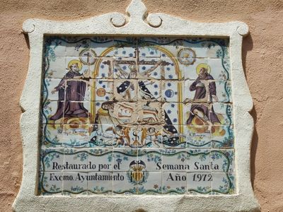 Ceramic panel of Our Lady of Sorrows at Església dels Àngels square, ceramic panel in Valencia, Spain