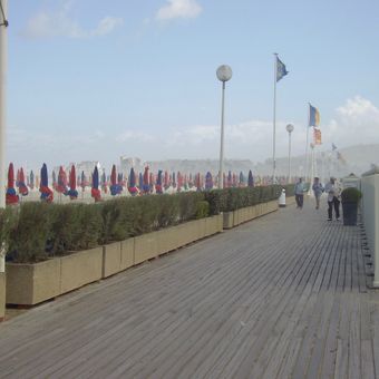Die Strände von Deauville erstrecken sich entlang des Ärmelkanals mit goldenem Sand und bunten Sonnenschirmen, verbunden durch eine 643 Meter lange Holzpromenade.