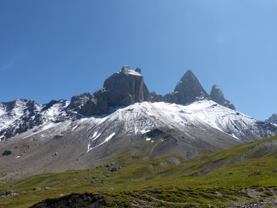 Die Aiguilles d'Arves bestehen aus drei verschiedenen Gipfeln mit einer Höhe von 3.514 Metern und bilden eine markante Form in den französischen Alpen.