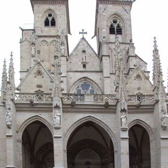 Die Notre-Dame-Stiftskirche zeigt hohe Rippengewölbe, Spitzbögen und Strebepfeiler, die ihre Steinmauern und Deckenstruktur stützen.