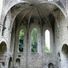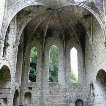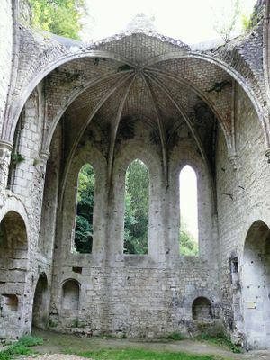 Die Abtei Notre-Dame de Fontaine-Guérard zeigt charakteristische Elemente der gotischen Architektur, einschließlich Spitzbögen, Kreuzrippengewölbe und Glasfenster.