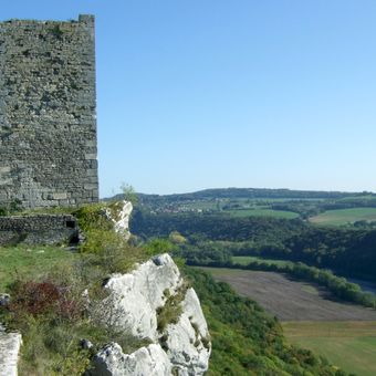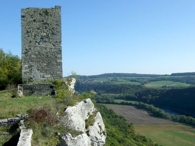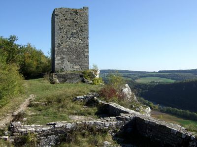 Die Burg verfügt über Außenmauern und einen vierstöckigen Hauptturm auf erhöhtem Gelände mit Blick auf das Doubs-Tal.