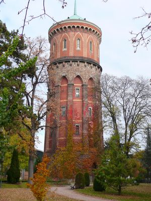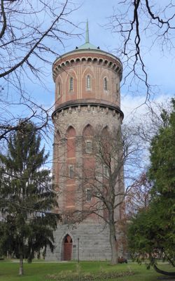 Der Wasserturm erreicht eine Höhe von 53 Metern mit einem Durchmesser von 12,3 Metern und weist Spitzbögen und Kragsteine auf.