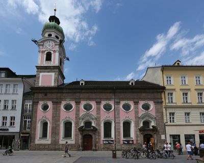 Die Kirche im Zentrum von Innsbruck bleibt tagsüber geöffnet, damit Besucher ihre architektonischen Merkmale und religiösen Gegenstände erkunden können.