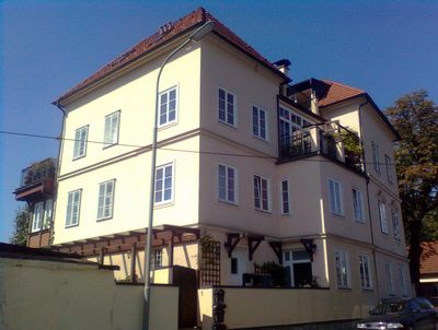 Villa Ferry mit brückenförmigem Übergang in den Garten/ehem. ORF Studio Steiermark