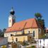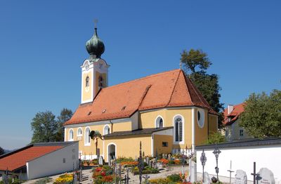 Die katholische Pfarrkirche St. Gotthard weist spätbarocke Architekturelemente auf, mit einer Zwiebelkuppel auf der Hauptstruktur.