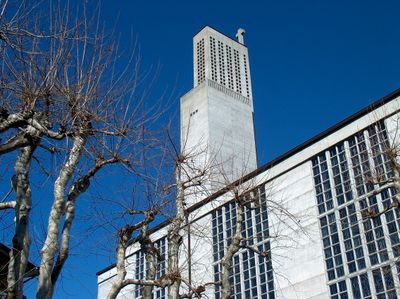 Die Antoniuskirche ist ein Betonbau, der sich durch klare Linien und geometrische Formen an der Kannenfeldstrasse 35 in Basel auszeichnet. Die Struktur zeigt moderne architektonische Prinzipien mit angularen Räumen und minimalistischen Details.