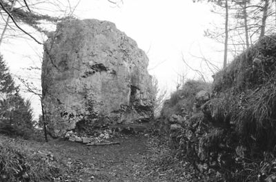 Natürliche Felskammern unter dem ehemaligen Wohnturm bildeten die Grundlage für die Nebengebäude der Burg.