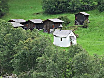 Kapelle St. Sebastian mit Gruppe Heustadel, Kapellengebäue in Niederwald im Kanton Wallis, Schweiz