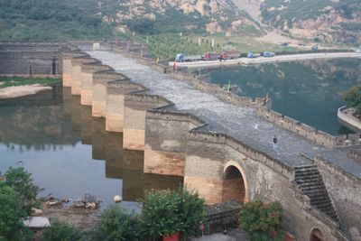 Der Name 'Jiumenkou' bedeutet 'Neun Tore' und bezieht sich auf die neun Bögen der Brücke, die das Bauwerk prägt. Besucher können sehen, wie die Mauer hier einzigartig mit dem Fluss verbunden ist und die Landschaft selbst Teil der Verteidigungslinie wurde.
