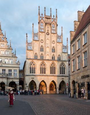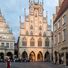 Das Historische Rathaus Münster zeigt gotische Architektur mit detaillierten Steinmetzarbeiten, Spitzbögen und einer markanten Fassade, die nach Kriegsschäden des Zweiten Weltkriegs rekonstruiert wurde.