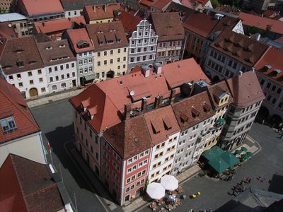 Der Untermarkt zeigt eine zentrale Häuserreihe namens 'die Zeile' und zahlreiche Renaissancebauten, darunter das Alte Rathaus und der Schönhof.