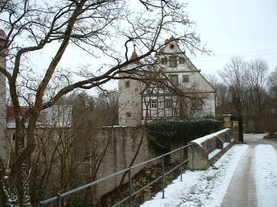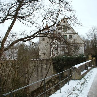 Die Burg verfügt über einen zentralen Bergfried umgeben von Befestigungsmauern, errichtet auf einer Anhöhe im Landkreis Schwäbisch Hall.