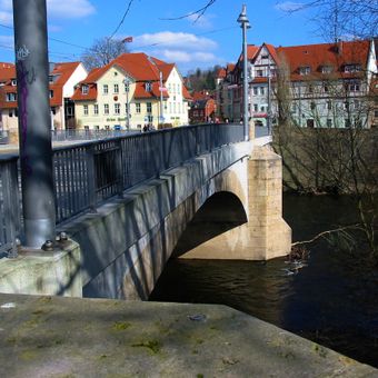 Die Camsdorfer Brücke überspannt die Saale mit neun Bögen und verbindet das Zentrum von Jena mit dem Stadtteil Wenigenjena.