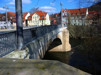 Erbaut 1480 aus Steinen zerstörter Burgen am Hausberg, wurde die Brücke 1946 nach der Zerstörung im Zweiten Weltkrieg wiederaufgebaut.
