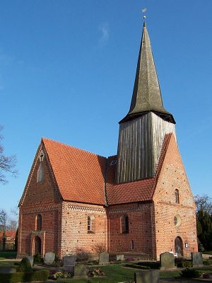 Ein Holzturm aus dem 17. oder 18. Jahrhundert verändert das ursprüngliche romanische Design dieses ländlichen Kirchenbaus in Mecklenburg.