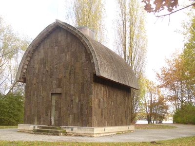 Die Einsiedelei steht im Neuen Garten und zeigt sich als runde Waldstruktur mit einem Schilfrohdach, das mit Eichenrinde bedeckt ist.