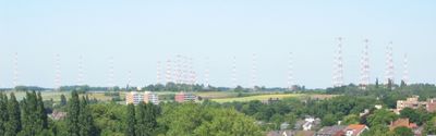 Das Sendezentrum Jülich verfügt über zehn leistungsstarke Sender, die jeweils 100 Kilowatt durch Dipolanordnungen auf Stahlrahmentürmen erzeugen.