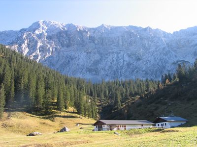 Die Wettersteinalm liegt auf 1464 Metern Höhe in der Wettersteingruppe mit Blick auf die Alpengipfel und Weideflächen.