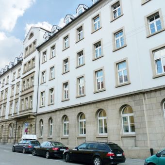Das Hotel Silber befindet sich in der Dorotheenstraße 10 in Stuttgart und zeigt eine rechteckige Struktur mit traditionellen deutschen Architekturelementen.