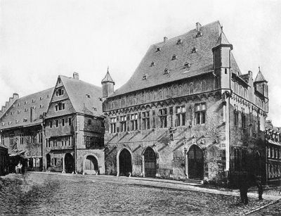 Das Leinwandhaus zeigt ein steiles Walmdach, Zinnen mit sechseckigen Türmchen und Kreuzstockfenster der gotischen Architektur.