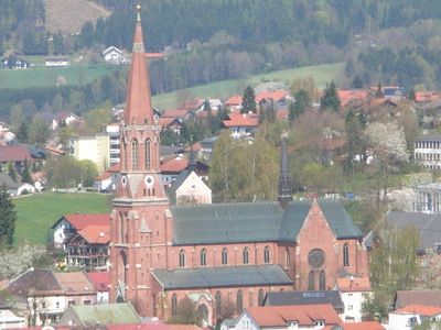 Sankt Nikolaus steht im Zentrum von Zwiesel mit ihrer Ziegelkonstruktion und hohen Fenstern, die für die neugotische Architektur charakteristisch sind.