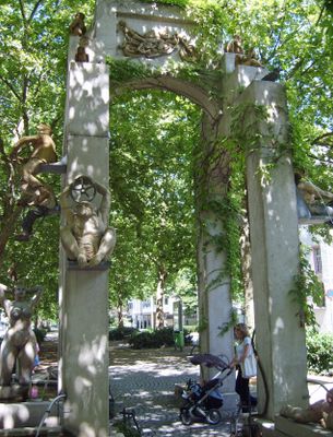 Der deutsche Bildhauer Peter Lenk schuf dieses Werk 1992 als moderne Interpretation traditioneller öffentlicher Brunnen in städtischen Räumen.