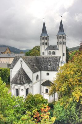 Die Neuwerkkirche steht als dreischiffige Basilika mit zwei achteckigen Türmen, erbaut aus verputztem Bruchstein im romanischen Baustil.