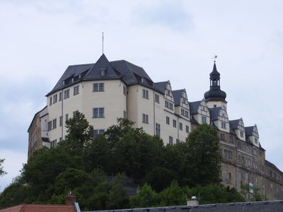 Das Schloss steht auf einem 50 Meter hohen Bergkegel, der durch die Weiße Elster im Süden und Westen geformt wurde.
