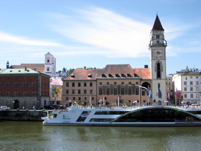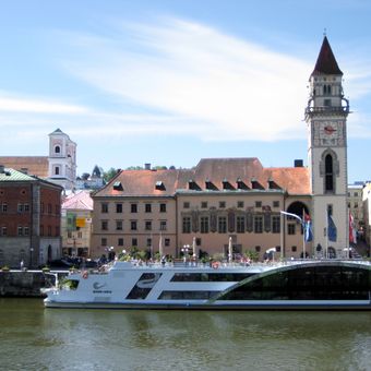 Das Rathaus Passau steht nahe dem Zusammenfluss dreier Flüsse und weist gotische Architektur sowie einen Turm mit historischen Hochwassermarken auf.